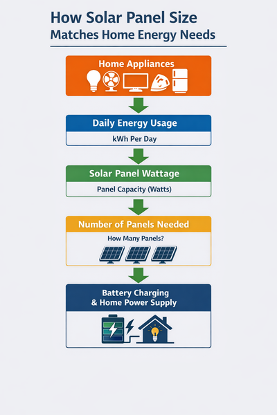 The diagram shows the flow: Home Appliances → Daily Energy Usage → Required Panel Wattage → Number of Panels → Battery Charging & Home Power Supply. It makes sizing much easier to visualize.